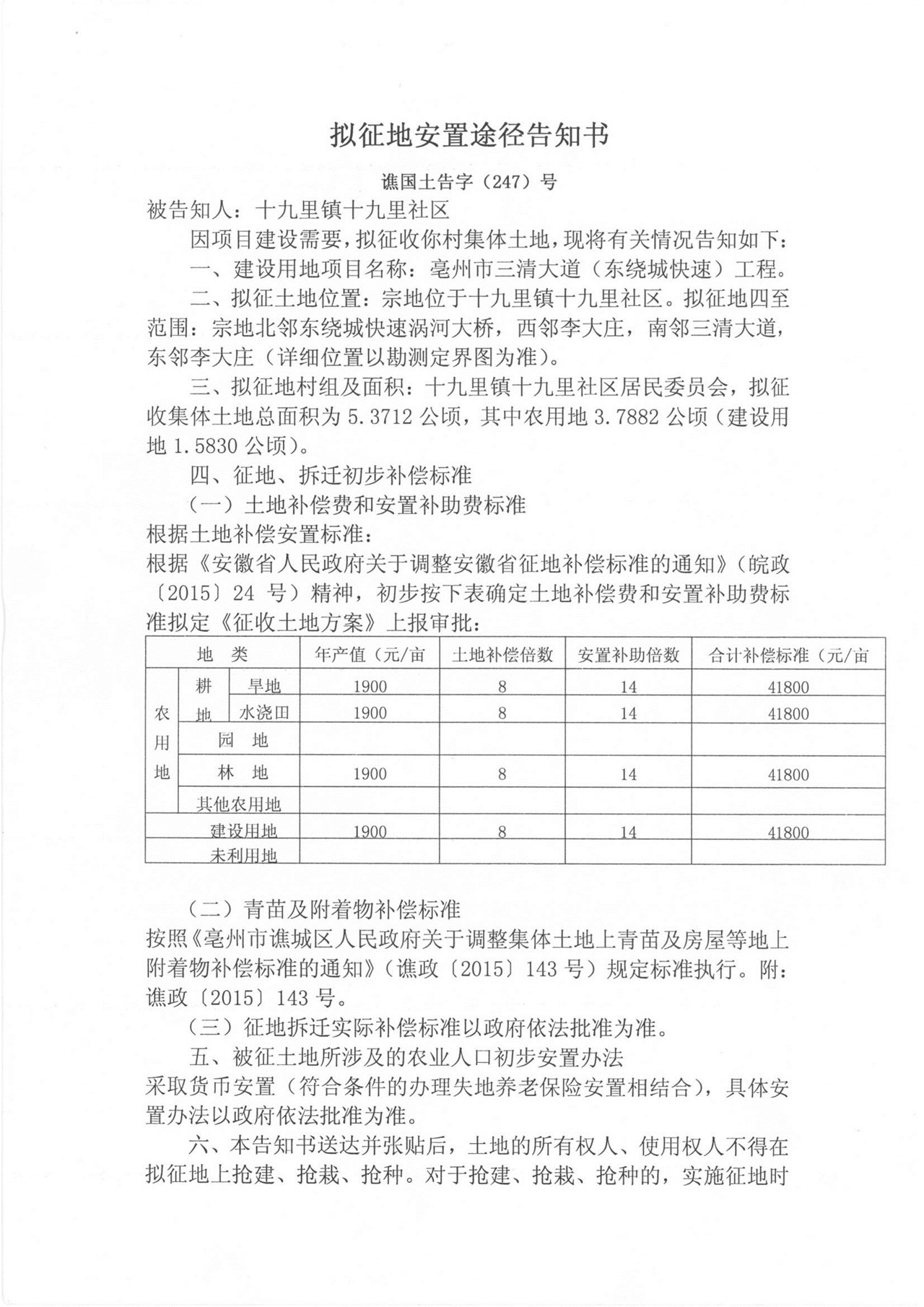 亳州市三清大道(东绕城快速)工程拟征地安置途径告知书谯国土告字(247)号