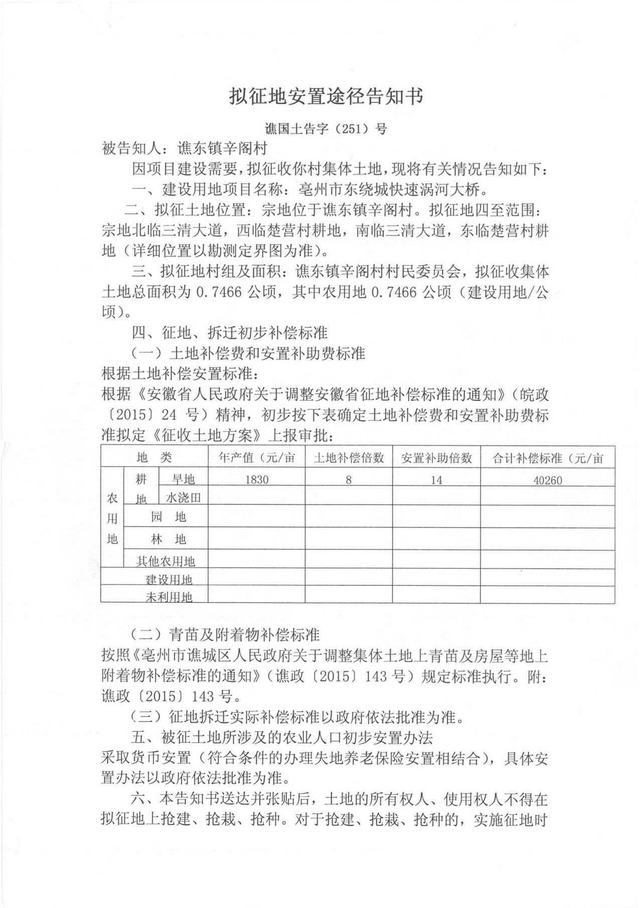亳州市三清大道(东绕城快速)工程拟征地安置途径告知书谯国土告字(251)号