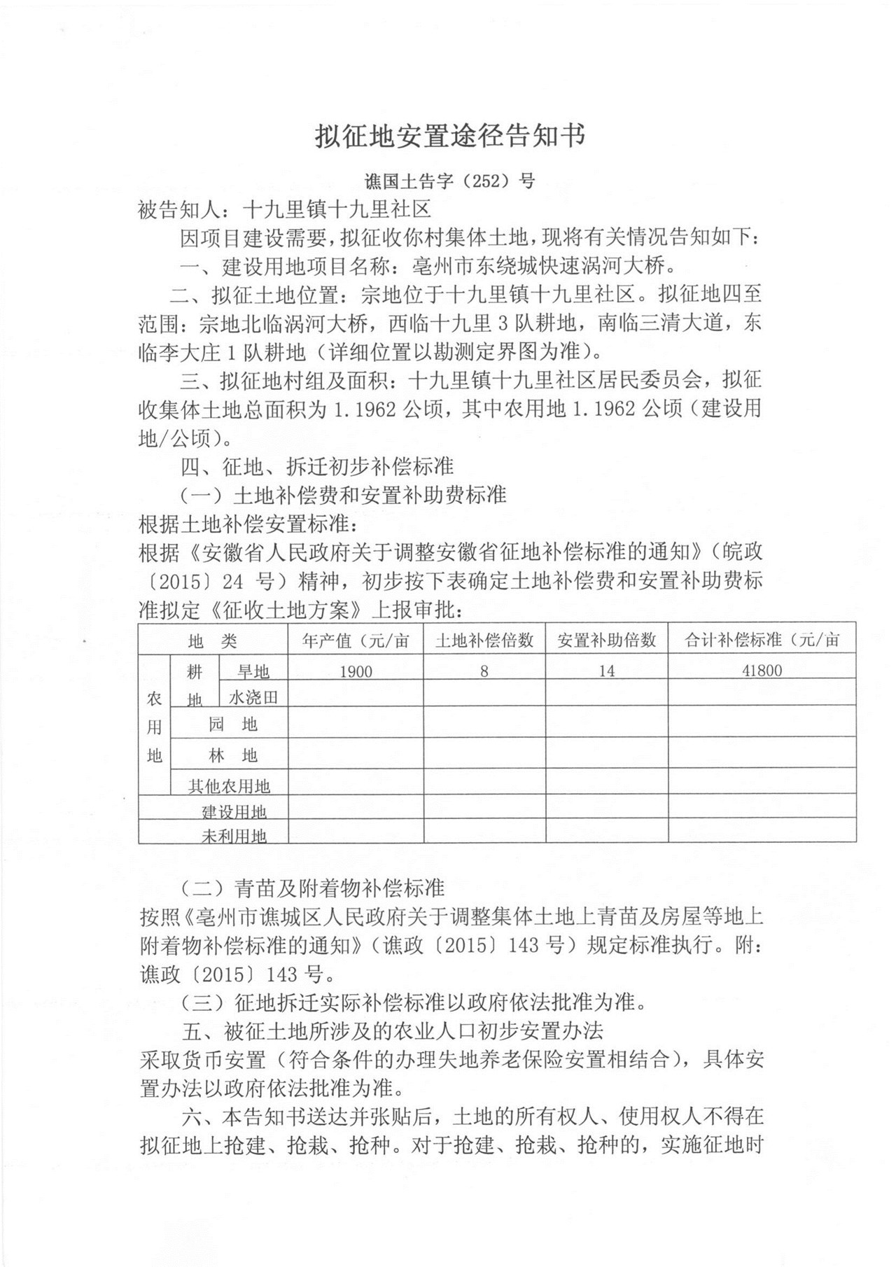 亳州市三清大道(东绕城快速)工程拟征地安置途径告知书谯国土告字(252)号