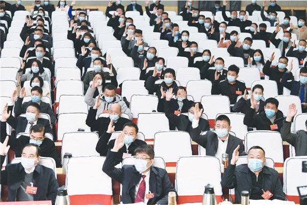 在1月10日召开的市五届人大一次会议上,市人大代表正在举手表决有关事项 张延林 摄