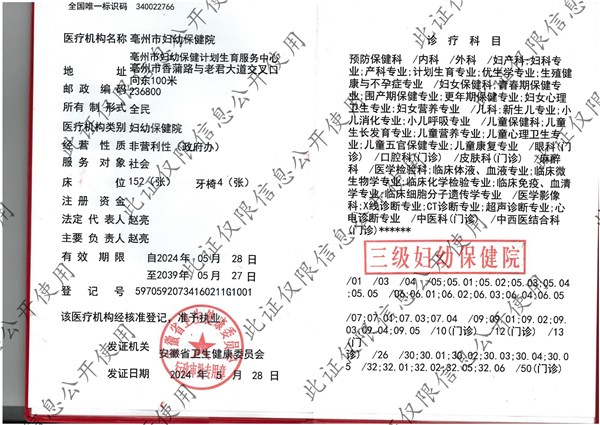 | 名称: | 亳州市妇幼保健计划生育服务中心医疗机构执业许可证(副本) | 文号: | 无 |