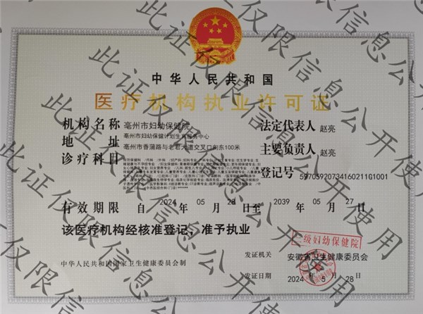| 名称: | 亳州市妇幼保健计划生育服务中心医疗机构执业许可证 | 文号: | 无 |