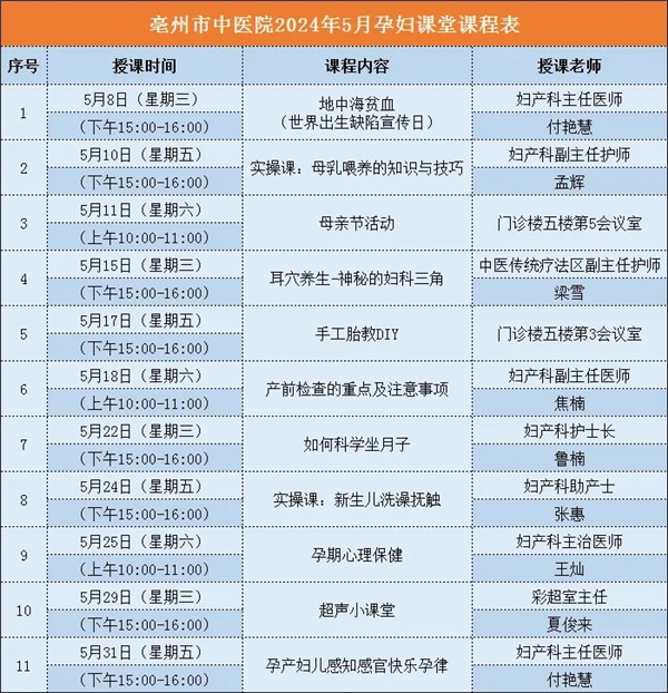 | 名称: | 听课有福利,亳州市中医院2024年5月孕妇学校课程表 |
