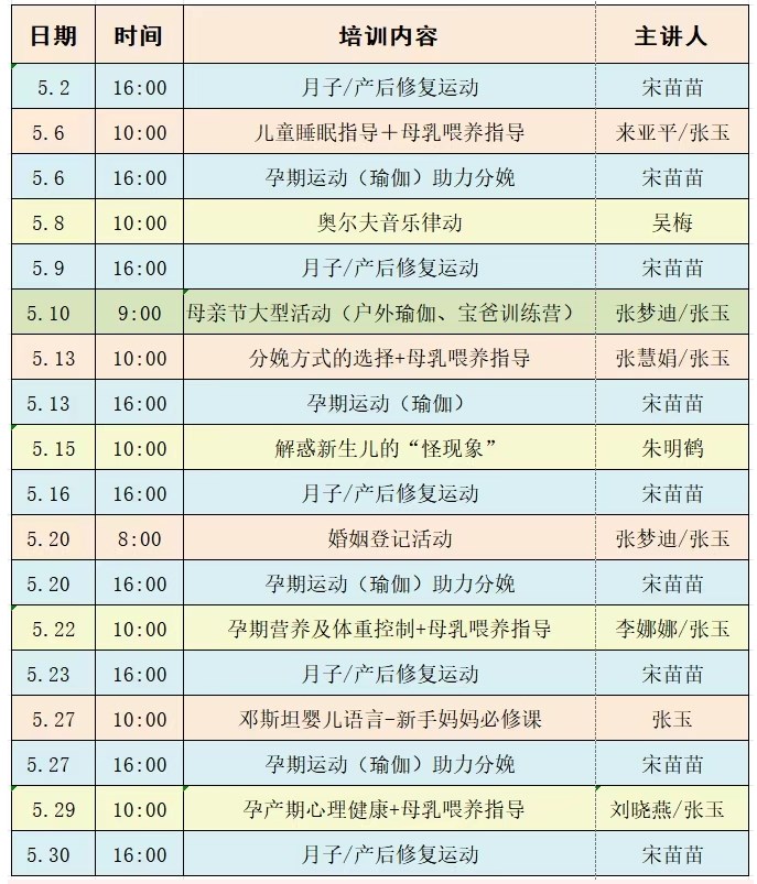 | 名称: | 孕妇学校五月份课程表 | 文号: | 无 |