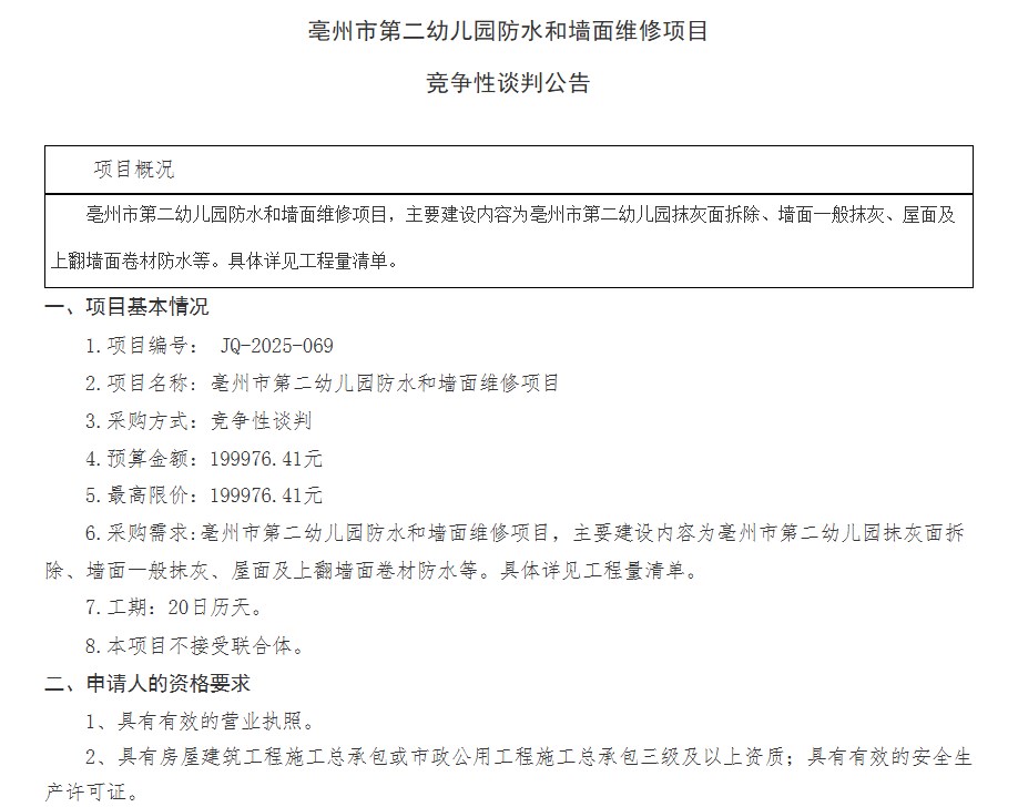 | 名称: | 亳州市第二幼儿园2025年楼顶防水招标、中标公告 |