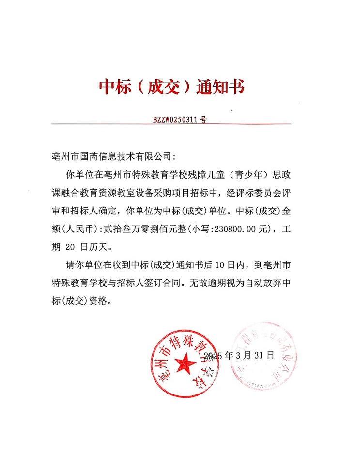| 名称: | 亳州市特殊教育学校残障儿童(青少年)思政课融合教育资源教室设备采购项目中标结果及具体实际执行情况 |