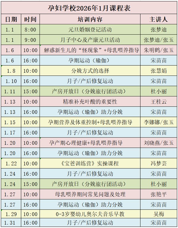 | 名称: | 【孕妇学校】2026年1月份课程表新鲜出炉,快来约课吧! | 文号: | 无 |