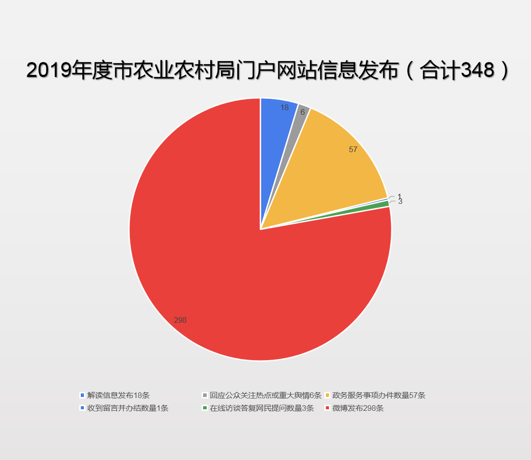 2019年,市农业农村局门户网站信息发布总数348条,解读信息发布18条,回应公众关注热点或重大舆情6条,政务服务事项办件数量57条,收到留言并办结数量1条,在线访谈答复网民提问数量3条,微博发布298条。