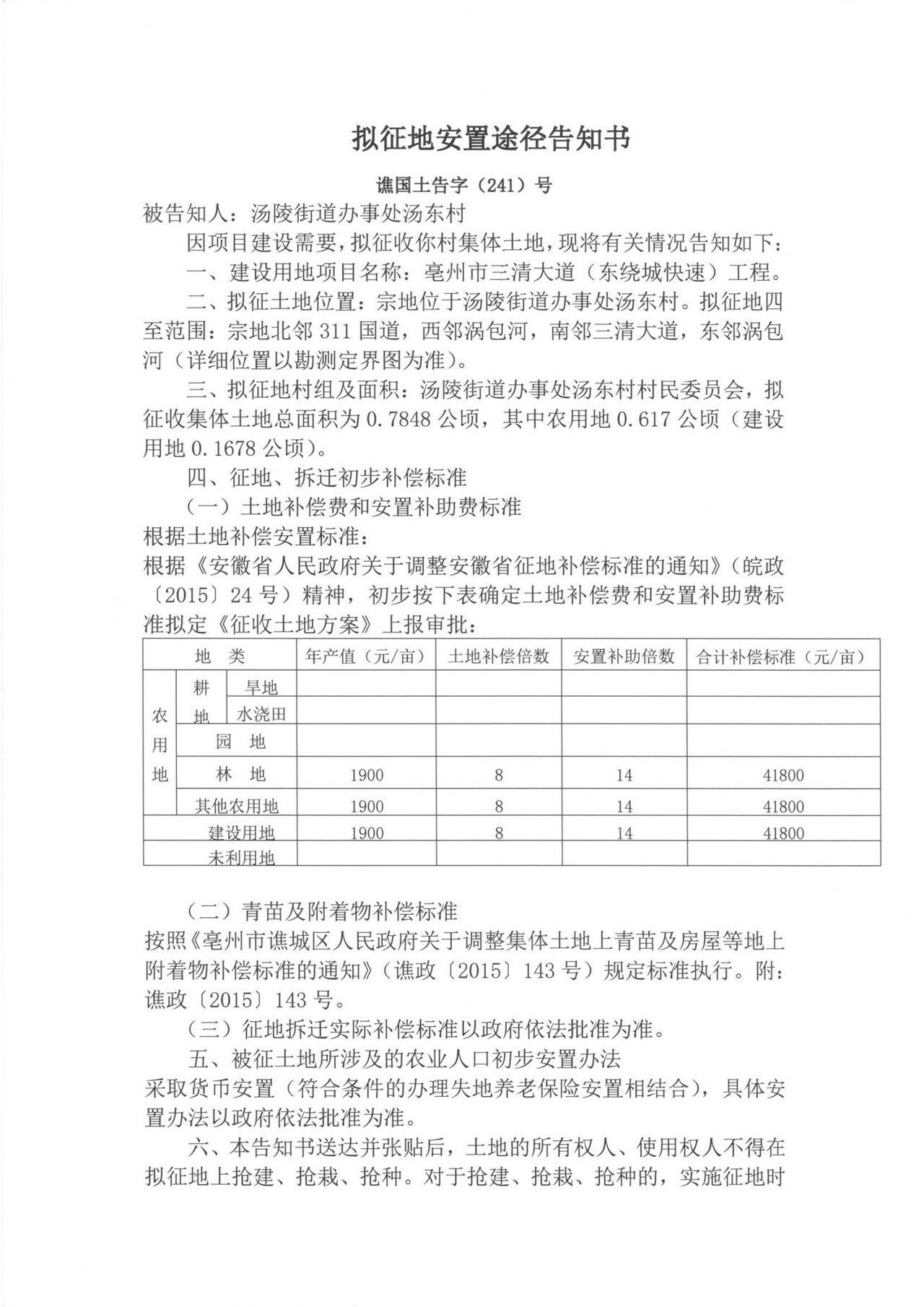 亳州市三清大道(东绕城快速)工程拟征地安置途径告知书谯国土告字(241)号