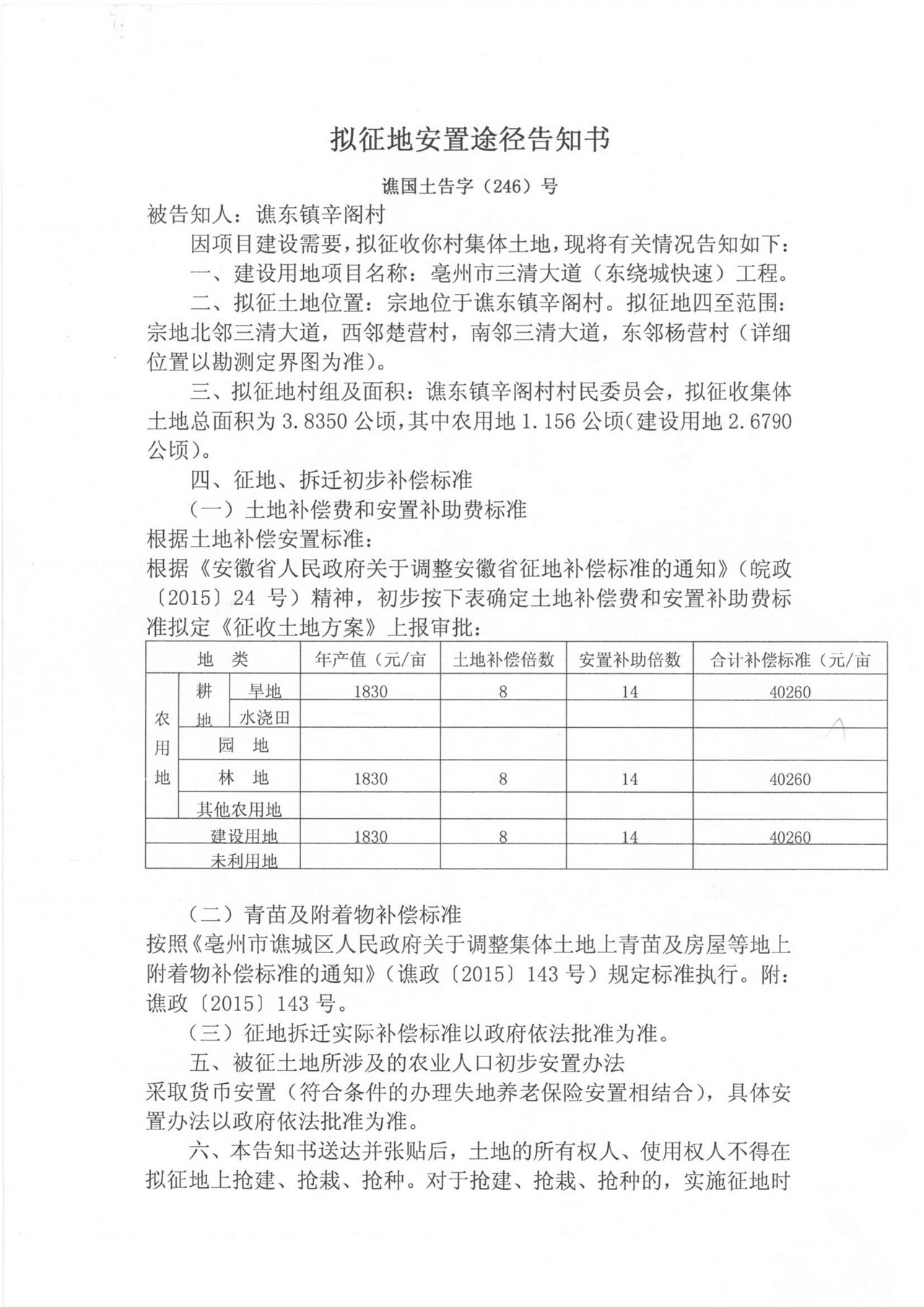 亳州市三清大道(东绕城快速)工程拟征地安置途径告知书谯国土告字(246)号