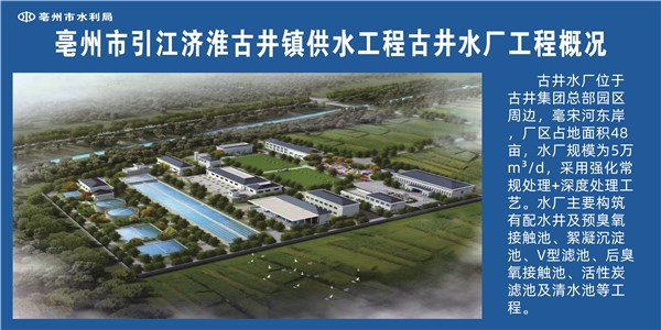 古井水厂位于古井集团总部园区周边,亳宋河东岸,厂区占地面积48亩,水厂规模为5万m2/d,采用强化常规处理+深度处理工艺。水厂主要构筑有配水井及预臭氧接触池、絮凝沉淀池、V型滤池、后臭氧接触池、活性炭滤池及清水池等工程。