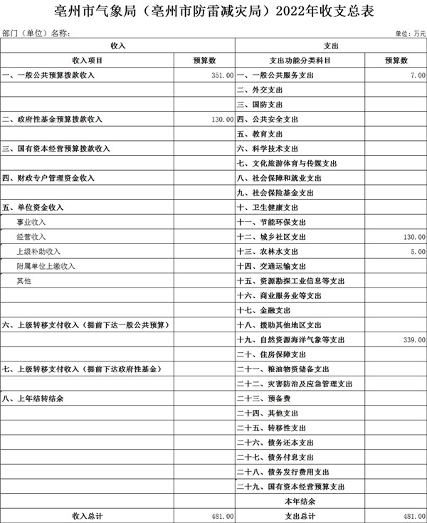 亳州市气象局(亳州市防雷减灾局)2022年收入预算481万元,其中,本年收入481万元,上年结转结余0万元。
