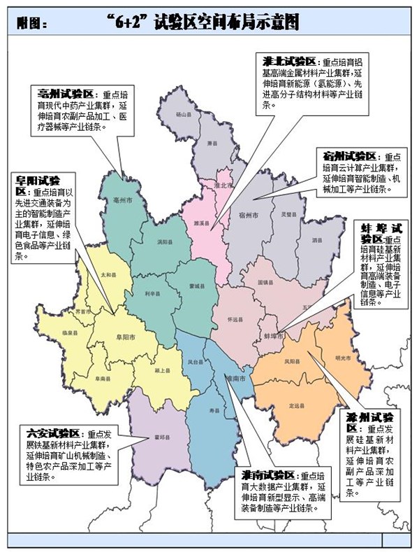“两区”:阜阳都市区重点承接现代医药、煤基材料、绿色食品、机械电子、纺织服装、节能环保、智能制造等;亳州都市区重点承接现代中药、食品制造、农副产品加工、纺织服装、文化旅游、健康养老等。
