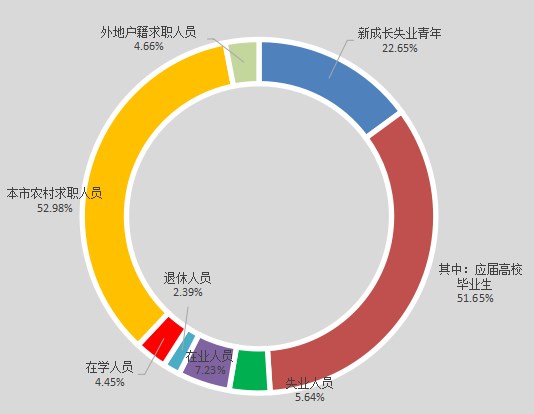 1.三季度本市农村求职人员仍为本季度人力资源市场求职主力,求职人数占比为52.98%,同时,离校未就业高校毕业生的增加,也使得新成长失业青年占据了较大比重,为22.65,但相较去年同期降低了5.32%。