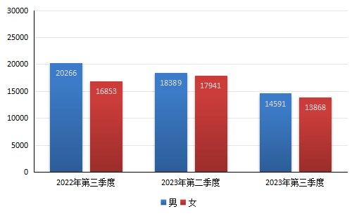 2023年第三季度市场供需情况皆有所下降,本季度用工单位需求总人数为44122人,登记求职总人数28459人。需求总数相较二季度减少10892人,与去年三季度同比减少16063人;求职总数环比减少7871人,同比减少8660人。三季度求人倍率(需求总人数/求职总人数)为1.55,环比上升0.04个百分点,同比下降0.07个百分点,人力资源市场总体供求状况基本稳定在合理范围。
