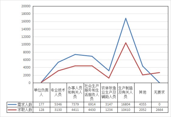 1.从产业需求看,第一产业需求人数占比相较上季度增加3%,第二产业需求人数占比相较上季度减少2.79%,第三产业需求人数占比相较上季度减少0.21%,三产所占的比重与上季度相比仅有轻微浮动。本季度第一、二、三产业需求人数所占比重依次为7.28%、42.49%和50.23%。