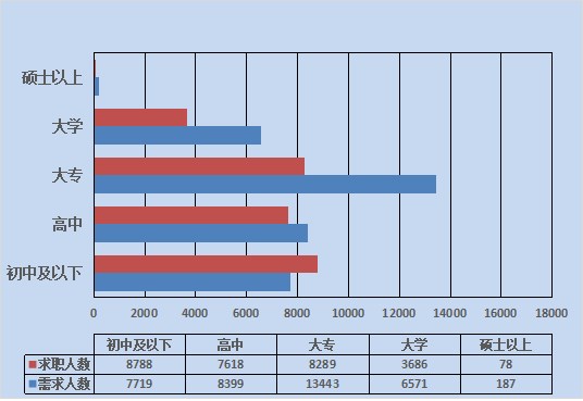 4.从文化程度分布看,本季度求职人群中,大专及以上学历占比达42.35,达到今年来最高比重,同时用人单位的需求中,要求大专及以上学历的占比也来到了45.78%,供求市场较为活跃。