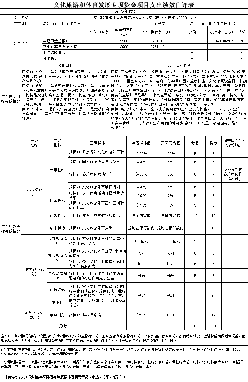 | 名称: | 2022年亳州文旅体局“文化旅游和体育发展专项资金”项目支出绩效自评表 |