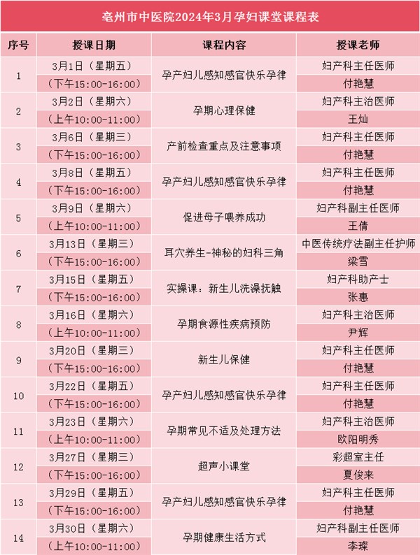 | 名称: | 亳州市中医院2024年3月孕妇学校健康讲座课程表 |