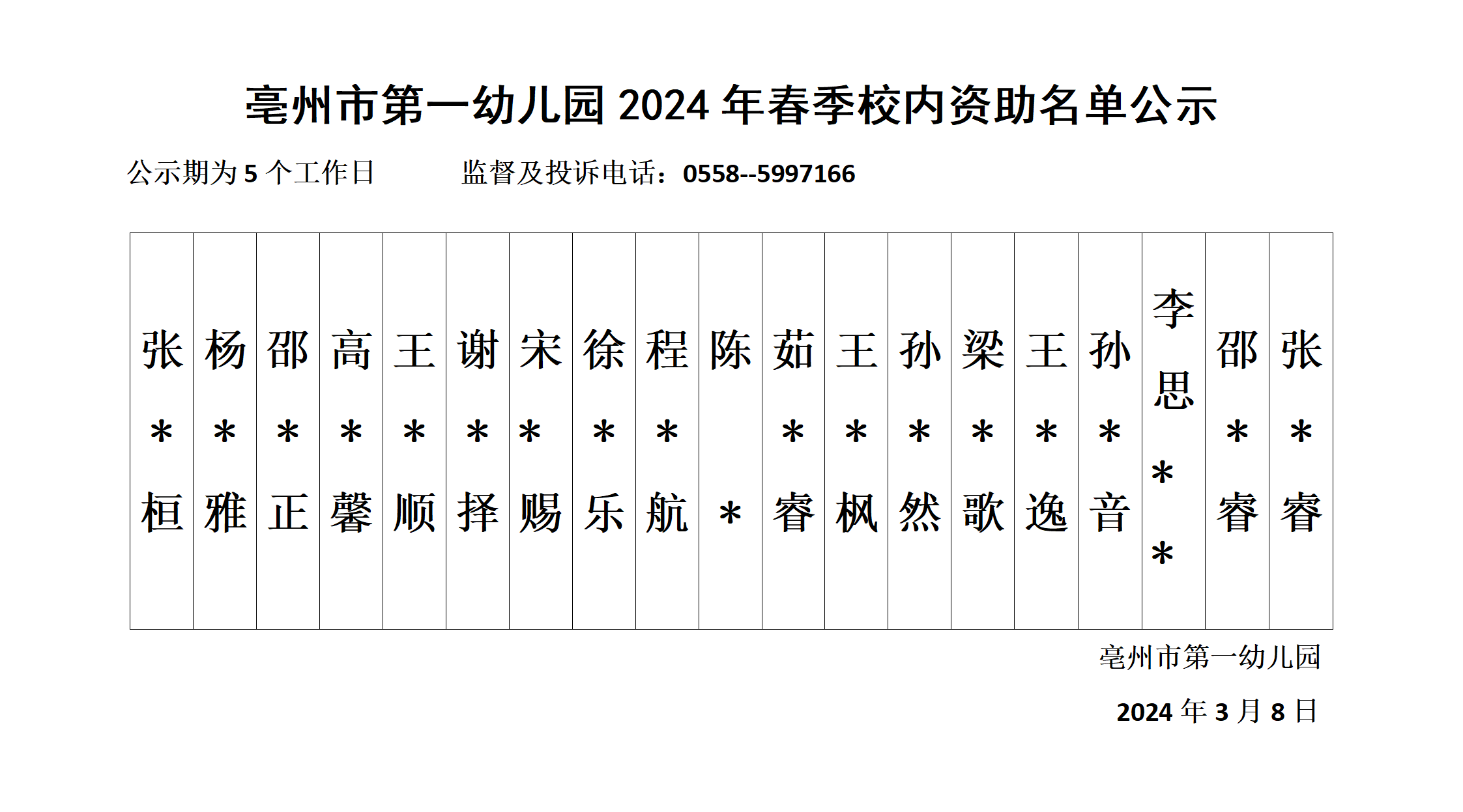 | 名称: | 亳州市第一幼儿园2024年春季校内资助名单公示 |