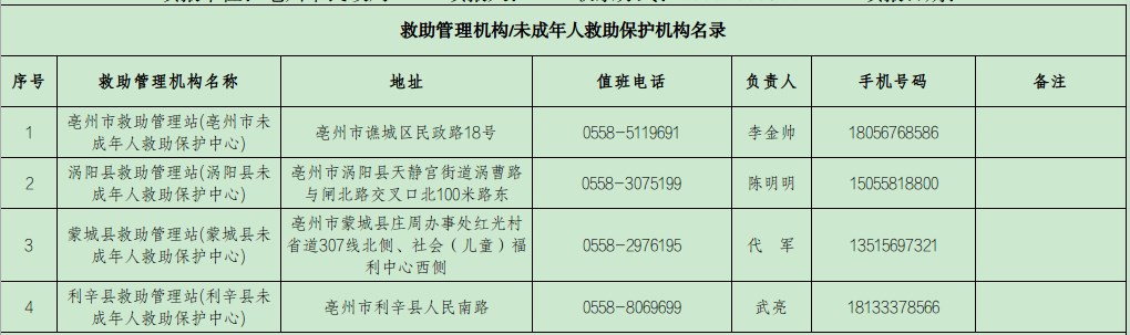 | 名称: | 2025年亳州市救助管理机构名录 | 文号: | 无 |