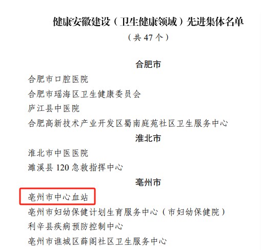 | 名称: | 祝贺!亳州市中心血站荣获“健康安徽建设(卫生健康领域)先进集体”称号 | 文号: | 无 |