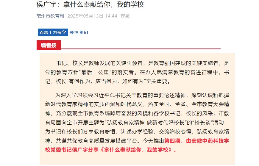 | 名称: | 安徽中药科技学校“校长谈”《拿什么奉献给你,我的学校》传递教育温度引好评 |