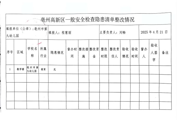 | 名称: | 亳州市第九幼儿园2025年春季安全隐患排查及整改情况 |