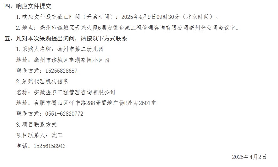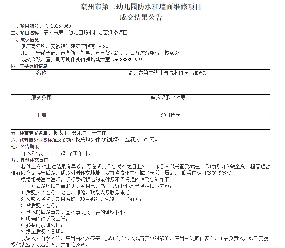 | 名称: | 亳州市第二幼儿园2025年楼顶防水招标、中标公告 |