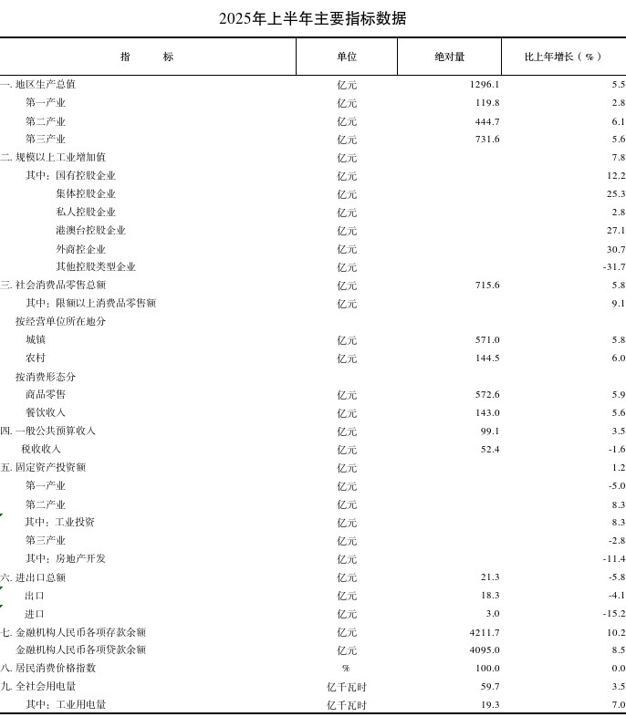 根据地区生产总值统一核算结果,上半年全市实现地区生产总值1296.1亿元,按不变价格计算,同比增长5.5%。分产业看,第一产业增加值119.8亿元,增长2.8%;第二产业增加值444.7亿元,增长6.1%;第三产业增加值731.6亿元,增长5.6%。