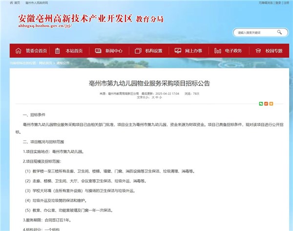 | 名称: | 亳州市第九幼儿园2025年物业服务采购项目招标公告 |