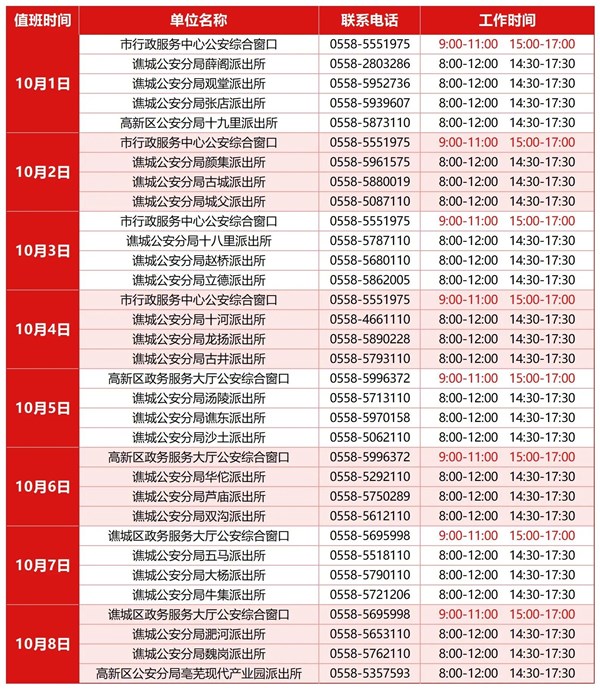 | 名称: | 转发+收藏,2025年国庆中秋假期亳州公安政务服务值班表来啦! |