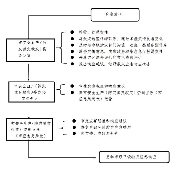 灾害发生后,市安全生产(防灾减灾救灾)委员会办公室经分析评估,认定灾情达到启动标准,市安全生产(防灾减灾救灾)委员会副主任(市应急局局长)决定启动三级响应,并向市委、市政府和省减灾委报告。