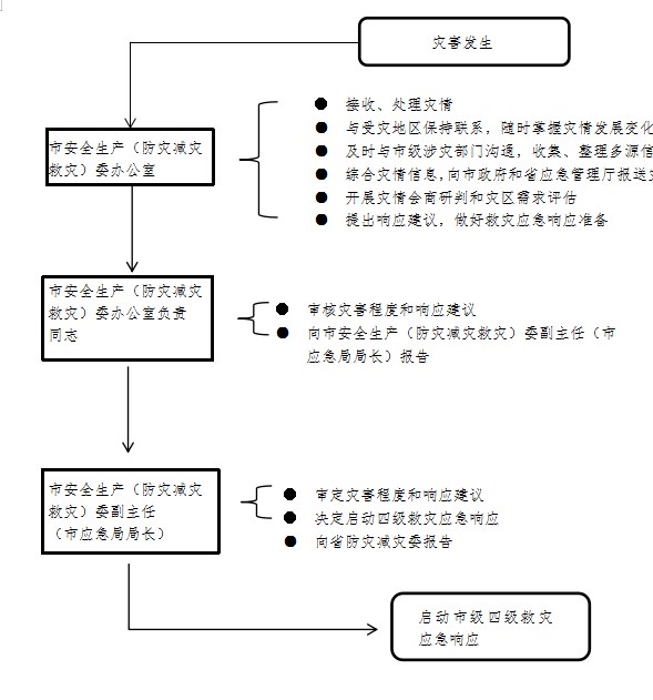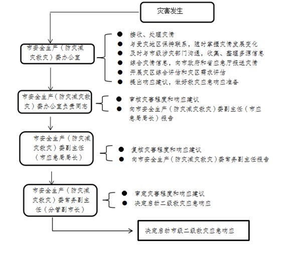 灾害发生后,市安全生产(防灾减灾救灾)委员会办公室经分析评估,认定灾情达到启动标准,向市安全生产(防灾减灾救灾)委员会提出启动二级响应的建议,市安全生产(防灾减灾救灾)委员会常务副主任决定启动二级响应,并向市委、市政府和省减灾委报告。