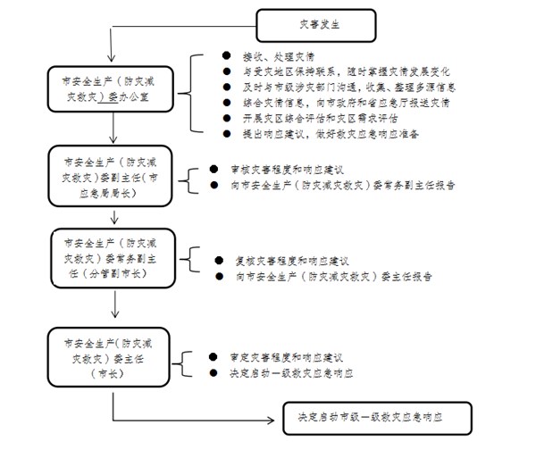 灾害发生后,市安全生产(防灾减灾救灾)委员会办公室经分析评估,认定灾情达到启动标准,向市安全生产(防灾减灾救灾)委员会提出启动一级响应的建议,按照市委、市政府决定,启动一级响应,并向省减灾委报告。